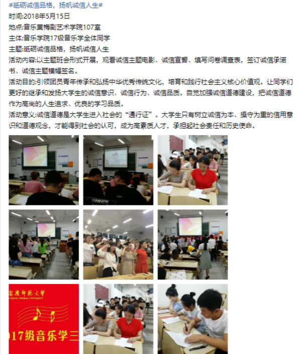共青团44118太阳成城集团委员会音乐学专业2017级3班团支部成立于2017年9月,现有成员38人,其中,党员15人(含预备党员6人),占比39.4%,入党积极分子累计占比84.2%。四年来,支部在上级的坚强领导以及成员的共同努力下,力争创建优秀团支部,当好党的助手和后备军,荣获安庆市“五四红旗团支部”、校“红旗团支部”、“优秀团支部”、“十佳班集体”、“先进班集体”等荣誉。