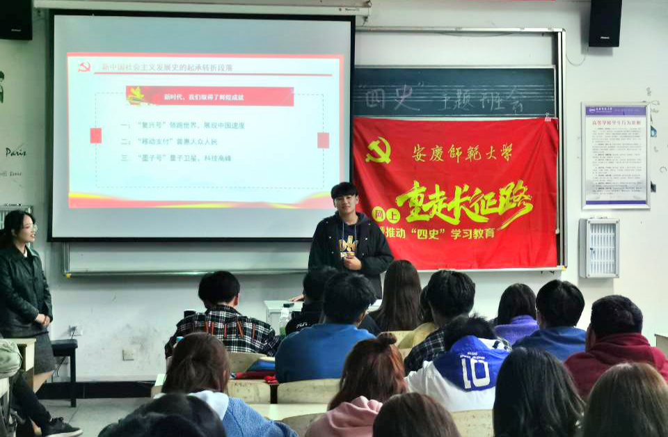 会议开始时,首先由辅导员卢星致辞,希望通过此次主题班会,同学们能够进一步了解四史,了解国家的过去、现在与将来。会中,各班团支书围绕着英雄、复兴、创新、信念四个重点主题的深化学习四史,同时与“四个自信”相结合,向大家阐述了自己对于四史的认识。英雄是人民的脊梁,复兴是人民觉醒的力量,创新是民族不竭的动力,信念是民族心中永屹的长城。2020级音乐学(4)班团支书荣波涛就以自身经历为例,发出由衷的感慨:“我爷爷告诉我,如果在过去几十年,回家是需要花费半天甚至一天的时间,如今只需几十分钟,我真切的感受到了科技的力量,这,就是中国速度!”