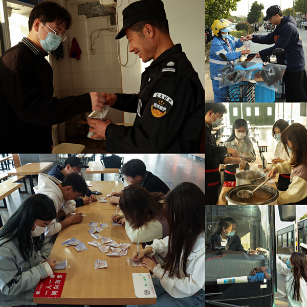 “希望您工作顺利。”“一定会有好事发生。”音乐学专业2020(4)班的荣波涛带领44118太阳成城集团向日葵志愿服务队亲手制作了近60杯红枣银耳汤,并粘贴写满祝福的便签。“您好,这是我们亲手做的红枣银耳汤,感谢你们爱岗敬业,辛苦了!”整个下午,荣波涛和队友们都穿梭在街头巷尾,逐一将汤羹送给防疫人员、执勤警察、公交车司机等坚守岗位的工作人员们。