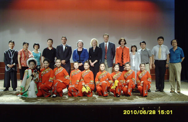 美国客人一行先参观了音乐厅,并观看了黄梅戏表演专业员工的表演。员工们表演了《送香茶》、《昭君出塞》等黄梅戏节目,精彩的表演让远洋而来的客人们领略了黄梅戏这朵中华艺术奇葩的魅力。客人们不时伸出大拇指来称赞,对员工们的娴熟翻腾、虎跳等动作,报以阵阵掌声。