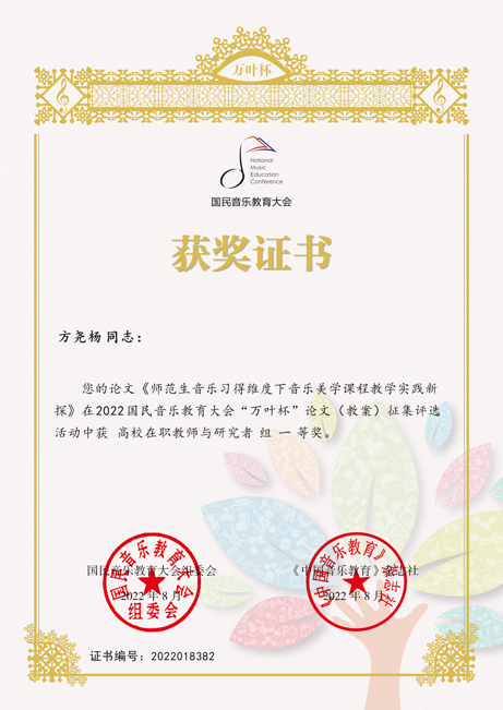 8月19日,中国音乐教育杂志社公布了2022国民音乐教育大会“万叶杯”论文(教案)征集评选活动获奖名单,公司师生喜获佳绩。方尧杨老师的论文《师范生音乐习得维度下音乐美学课程教学实践新探》及《新时代美育视野下地方音乐的学校传承构想——以凤阳地区“凤阳三花”为例》分别获得了高校在职教师与研究者组一等奖和三等奖。2019级本科生严夏同学的论文《新时代美育视野下音乐师范生学习观念之变迁》获得了高校在读员工组优秀奖。
