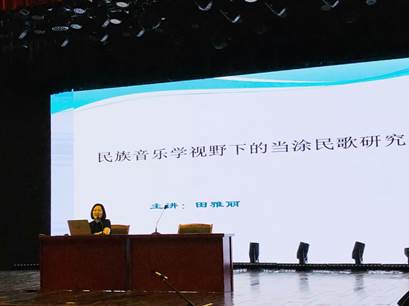 田雅丽教授首先简要介绍了民族音乐学的概念、研究对象和研究理念,随后评述了当涂民歌的历史源流、总体特征和研究现状,最后向大家分享自己对当涂民歌进行田野调查、搜集整理、创作改编、演出实践的经验。田教授的报告既科学严谨,又活泼生动,她与师生分享了大量采风与演出的视频,更亲自范唱了两首当涂民歌,从而拉近了广大师生与民间音乐的距离,使公司师生深切地感受到了民间音乐的魅力。