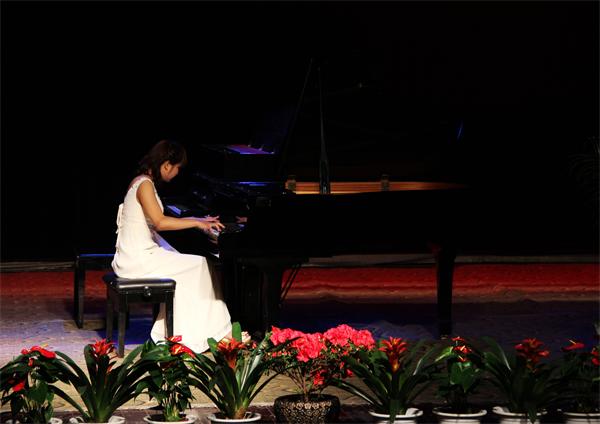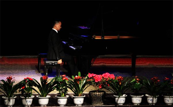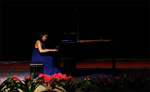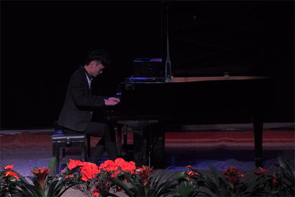 音乐会由《黄河船夫曲》序曲开始,由10级员工陈永霞演奏杨飞虎老师协奏,师生默契的配合把黄河钢琴协奏曲的前两个乐章呈现出来;11级戴心同学演奏了莫扎特奏鸣曲K.333和肖邦op.25.1“竖琴”练习曲,莫扎特中流露出“含着眼泪的微笑”,而肖邦中流露着一丝莫扎特般天使之歌;陈永霞演奏的2首肖邦《夜曲》一直给人宁静和优雅,使现场的观众们陶醉在优美的旋律和动听的和声之中。接下来在主持人杨顺的即兴演唱助兴后,由钟王君同学演奏了钢琴曲《浏阳河》,运用了变奏的手法,通过逐次加花的方式加厚旋律的线条,丰富的表现力使得现场达到第一次高潮。中场休息后,荣丽娟同学以饱满而又低沉的低音和弦组拉开贝多芬的《悲怆奏鸣曲》开始,全场瞬间安静,细细的聆听,观众仿佛能从他的悲怆中听到贝多芬再诉说他那坎坷不平的人生。车尔尼的八度练习曲时而像一首长号协奏曲,时而像一首轻快的波尔卡,进一步展现了演奏者技术。紧接着便是梁媛辰同学演奏的贝多芬的巨作《黎明奏鸣曲》,活泼的跳音,清晰的倚音,都在诉说这黎明前的欢乐,为我们探寻清晨森林里活泼欢乐的大聚会,鸟儿在歌唱,松鼠在跳舞,黎明的欢歌正在森林里唱响,台下的观众闭目在细细品味,如痴如醉。随后由陈永霞再次登台演奏了颇具难度的拉赫马尼诺夫前奏曲和肖邦谐谑曲,充分展现了浪漫派的激情与创新,拓展了琴的全新演奏技术,并将传统和声发展到极致。最后,杨飞虎老师弹了一首充满了梦幻色的李斯特夜曲《爱之梦》,杨飞虎老师技巧娴熟,感情细腻与琴声很好的交融在一起,音乐深情婉转、给人安静,使听者如痴如醉,陶醉在琴声里,台下观众听得如痴如醉,在观众经久不息的掌声中,音乐会圆满的落下了帷幕。整场音乐会结构构思巧妙,用纯钢琴演绎了多首不同风格题材的中外经典作品,精选的片头一首意大利情歌和片尾土耳其进行曲也给听众留下了深刻的印象。