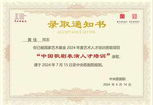 公司声乐专业博士黄佳,于2024年7月,参加了国家艺术基金重点资助项目“中国歌剧表演人才培训”。