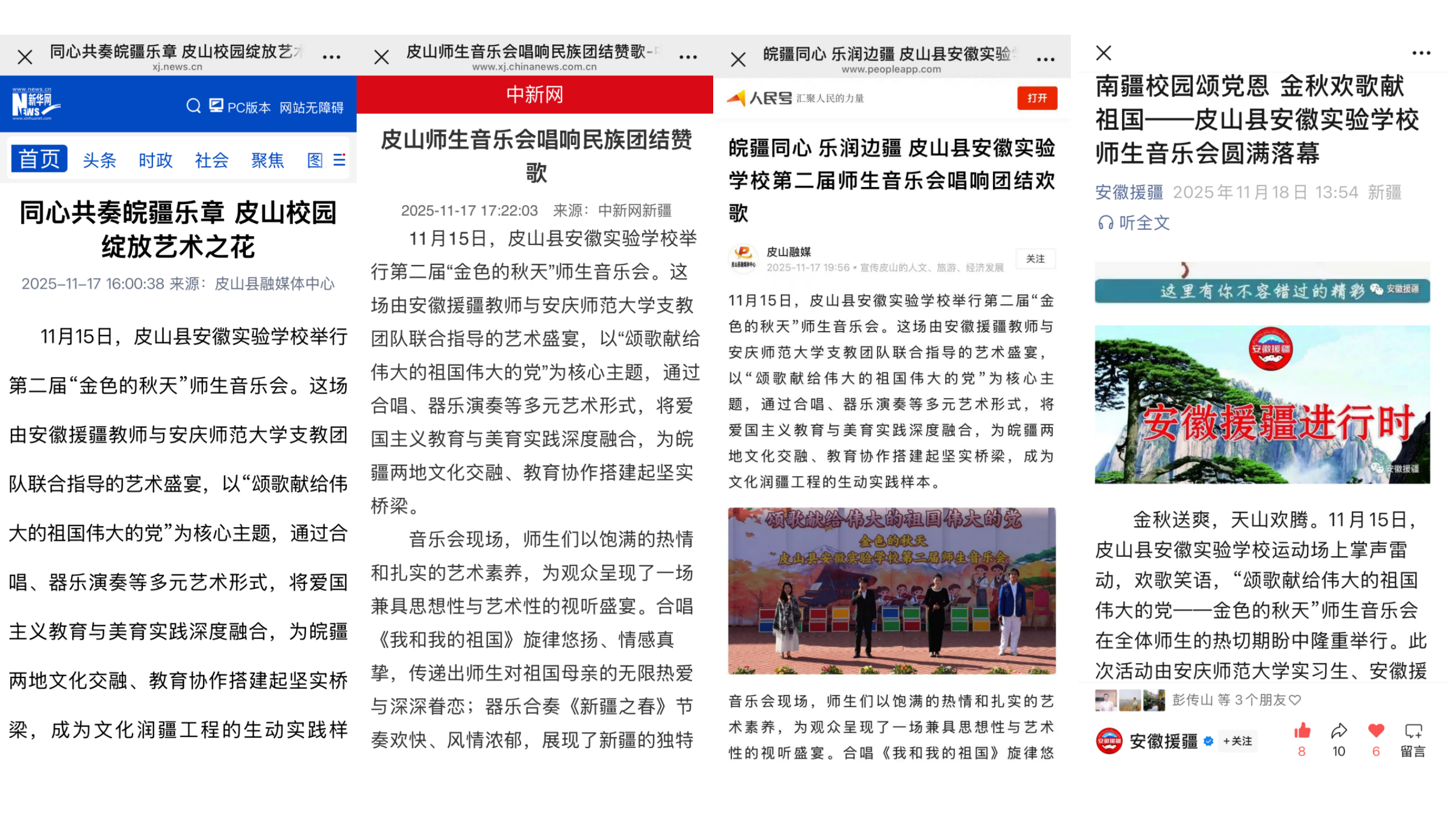 11月15日,由公司彭传山、魏星月、马凌云、喻心悦、陈帅等6名援疆支教师生组织并参演的“颂歌献给伟大的祖国伟大的党”——皮山县安徽实验学校“金色的秋天”第二届师生音乐会圆满落幕,反响热烈。新华网、中新网、人民网、安徽援疆网等媒体均对活动进行了报道,一致认为本场演出融合合唱、器乐演奏等多种艺术形式,将爱国主义教育与美育实践有机融合,为皖疆两地文化交融与教育协作搭建了坚实桥梁,是文化润疆工程的生动实践。