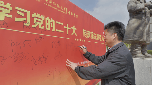 活动现场,师生纷纷与邓稼先雕像合影留念,并在主题展板上签名明志。