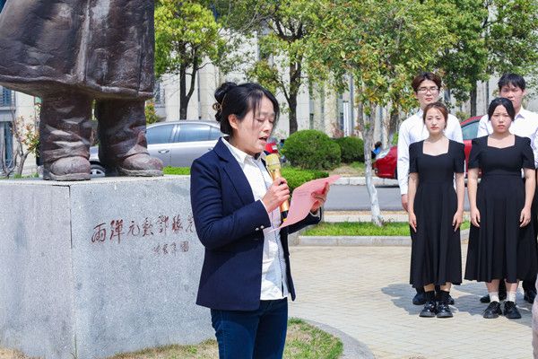 为缅怀邓稼先同志,张铭和徐冉代表学院向邓稼先雕像敬献了花篮,并带领全体师生面向邓稼先雕像鞠躬致敬。