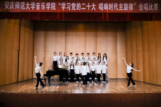 “我们在时代春风里,春风催我永开拓;我们在灿烂阳光下,跟着共产党建设大中国。”歌曲《在灿烂的阳光下》讲述了中国共产党领导全国人民走过的风雨历程,赞颂了中华人民共和国成立以来所取得的伟大成就,音乐学专业2022(3)班员工的歌声中充满了自豪和赞美。观众们也受到爱国激情的感染,跟着旋律打起节拍。
