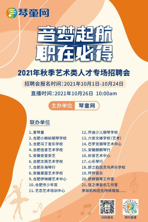 面对琴童网公司业务的不断发展壮大,合肥各大、中型机构对艺术类老师的迫切需求,琴童网与各机构联合共同开展2022届秋季毕业生招聘活动。具体说明如下: